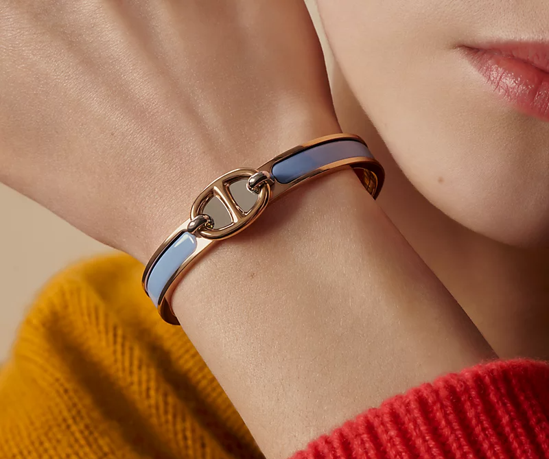 설명: 에르메스의 클릭 H 팔찌는 브랜드의 시그니처 H 모양 버클이 돋보이는 디자인으로, 에르메스만의 고급스러운 감각을 자랑합니다. 다양한 색상과 메탈 소재 옵션이 제공되어 계절이나 스타일에 구애받지 않고 착용할 수 있습니다. 특히 에나멜과 메탈의 조화가 세련미를 더해 캐주얼한 룩에서부터 포멀한 룩까지 소화 가능하여 데일리 아이템으로도 손색이 없습니다. 단, 에나멜 코팅 부분이 쉽게 스크래치가 발생할 수 있으므로 보관 시 주의가 필요합니다. 명품 전문가들은 이 팔찌가 단순한 액세서리를 넘어선 브랜드 아이덴티티의 상징이라 평가합니다.